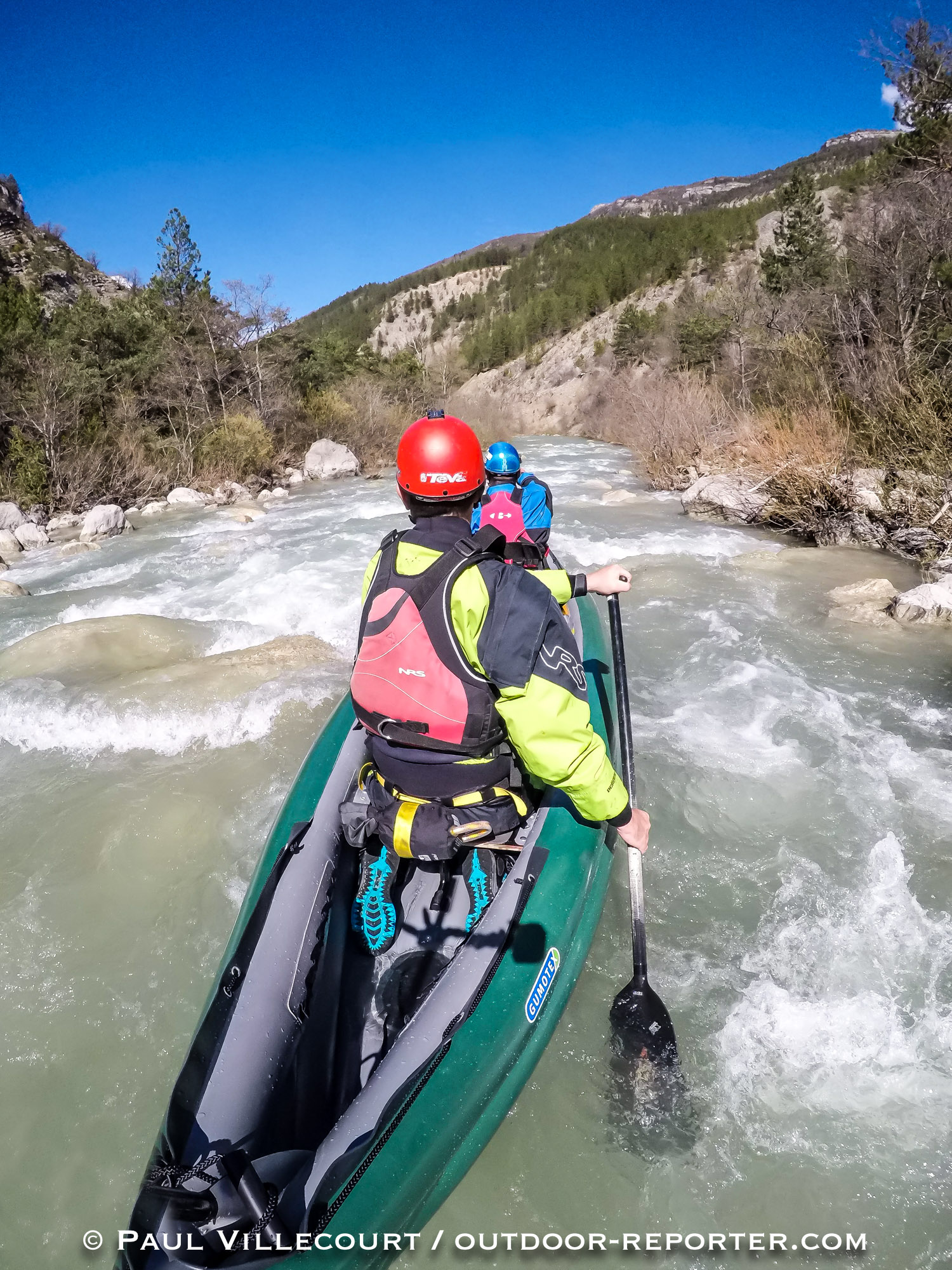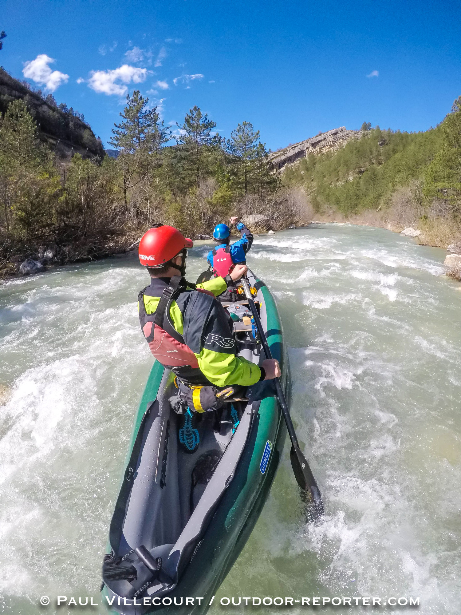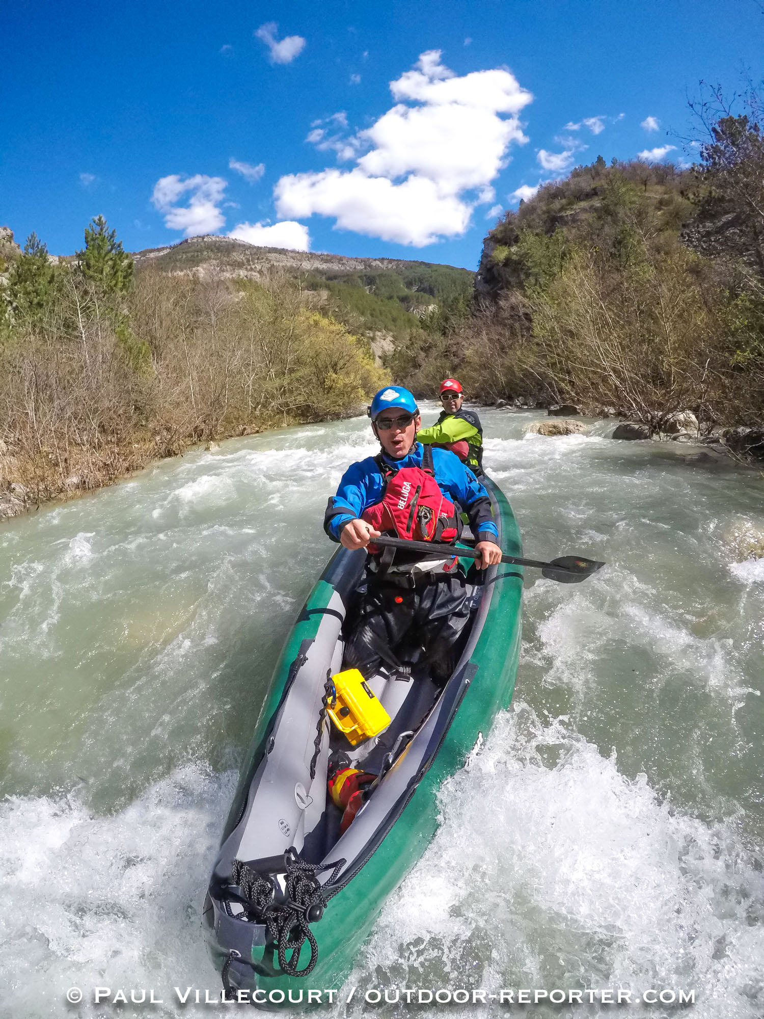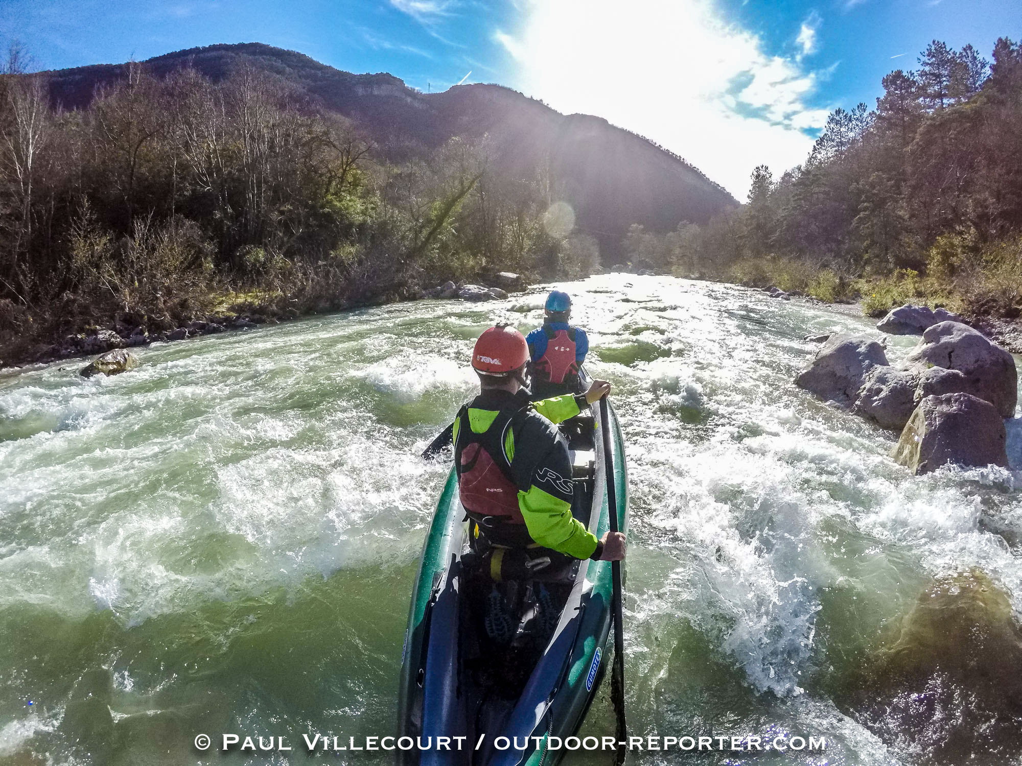 Du coup, nous avons eu envie de pousser le test un cran au-dessus. La Sure est une petite rivière oubliée, rarement en eaux, et surtout très courte : à peine 2 km. Mais quels parcours ! Une superbe série de petits seuils très techniques dans un décor à couper le souffle. Verdict : même pas mal ! Le Scout a franchi cet aqualand naturel avec facilité, et quand le parcours devenait trop dur, il permettait de sauter au bord en 2 secondes pour repérer. En plus d’être très stable, ce canoë gonflable (autovideur) est vraiment confortable.