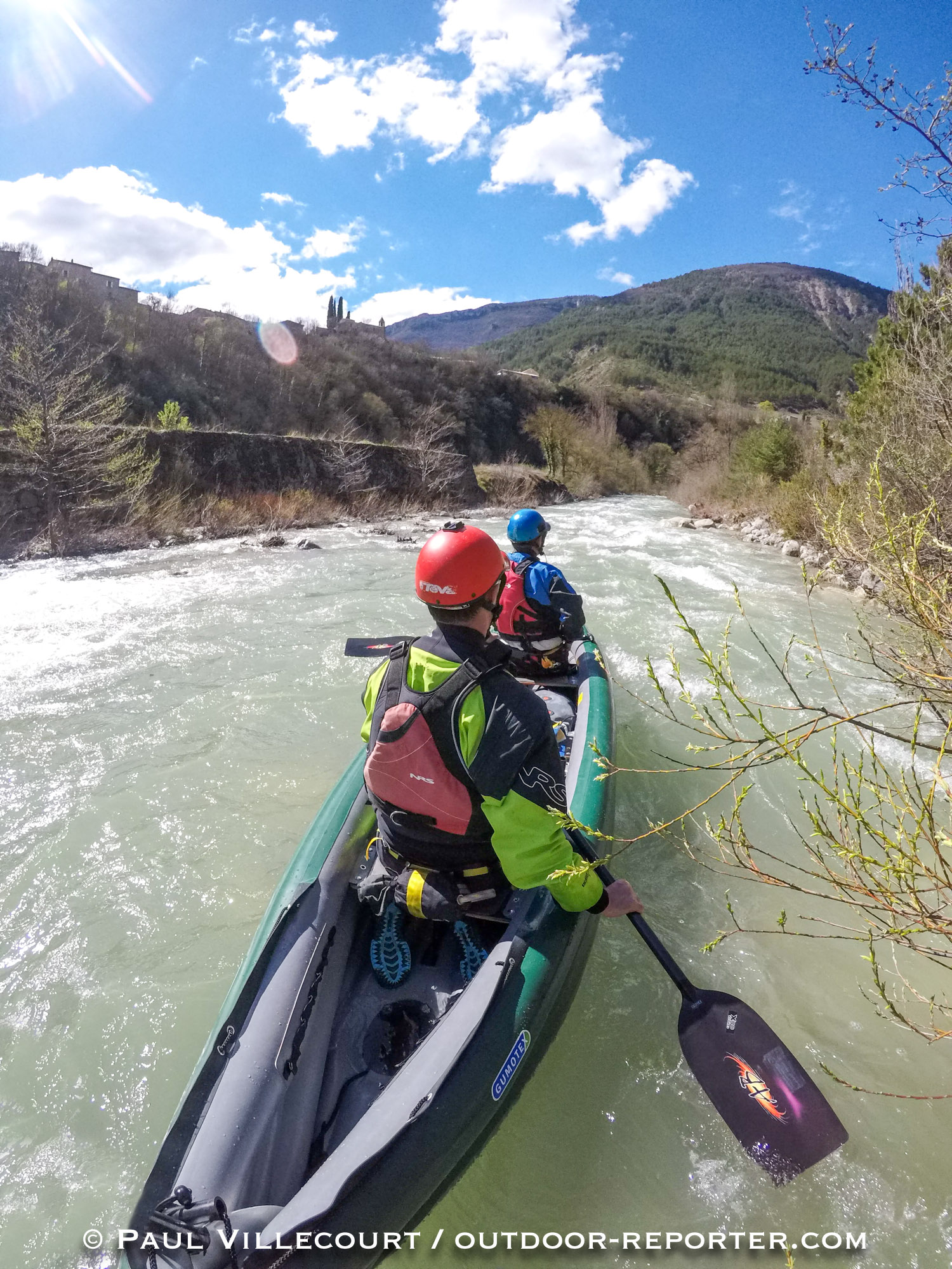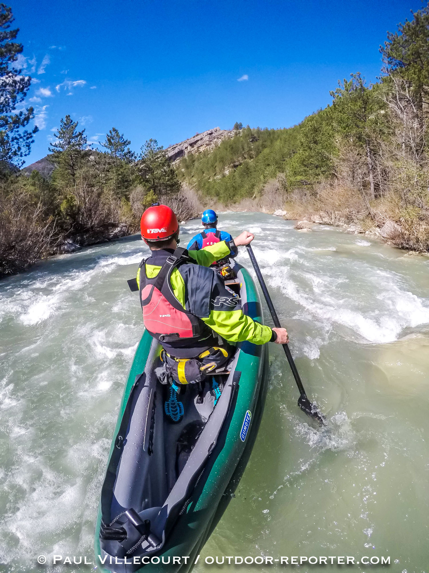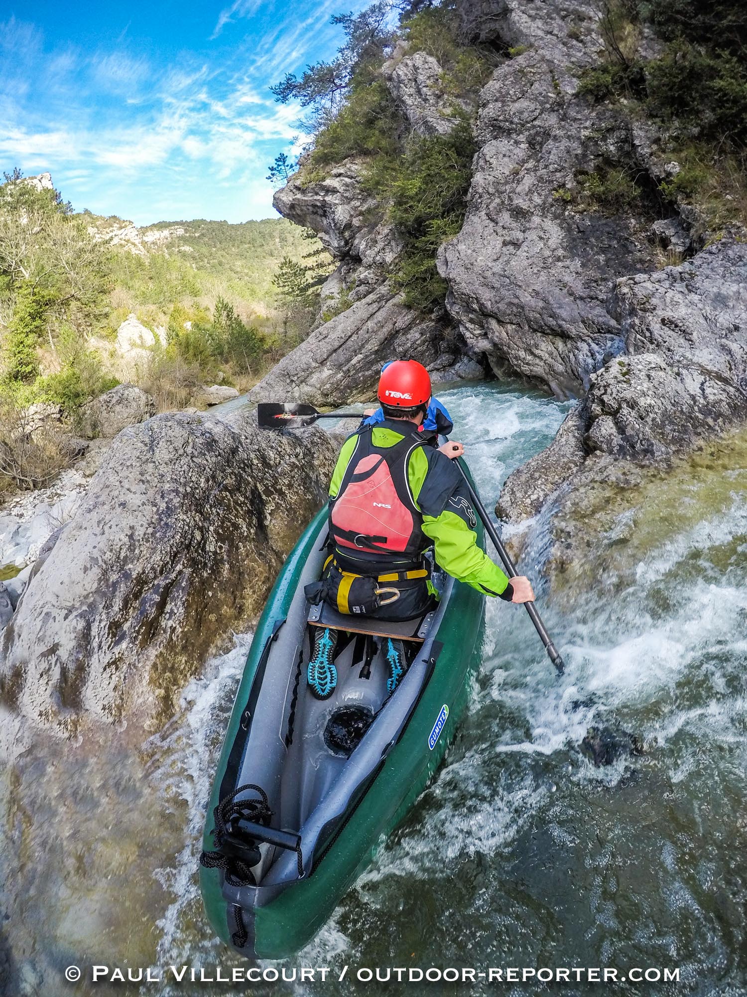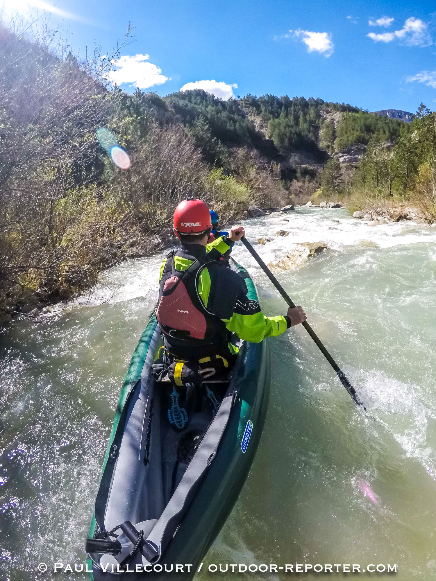 Du coup, nous avons eu envie de pousser le test un cran au-dessus. La Sure est une petite rivière oubliée, rarement en eaux, et surtout très courte : à peine 2 km. Mais quels parcours ! Une superbe série de petits seuils très techniques dans un décor à couper le souffle. Verdict : même pas mal ! Le Scout a franchi cet aqualand naturel avec facilité, et quand le parcours devenait trop dur, il permettait de sauter au bord en 2 secondes pour repérer. En plus d’être très stable, ce canoë gonflable (autovideur) est vraiment confortable.