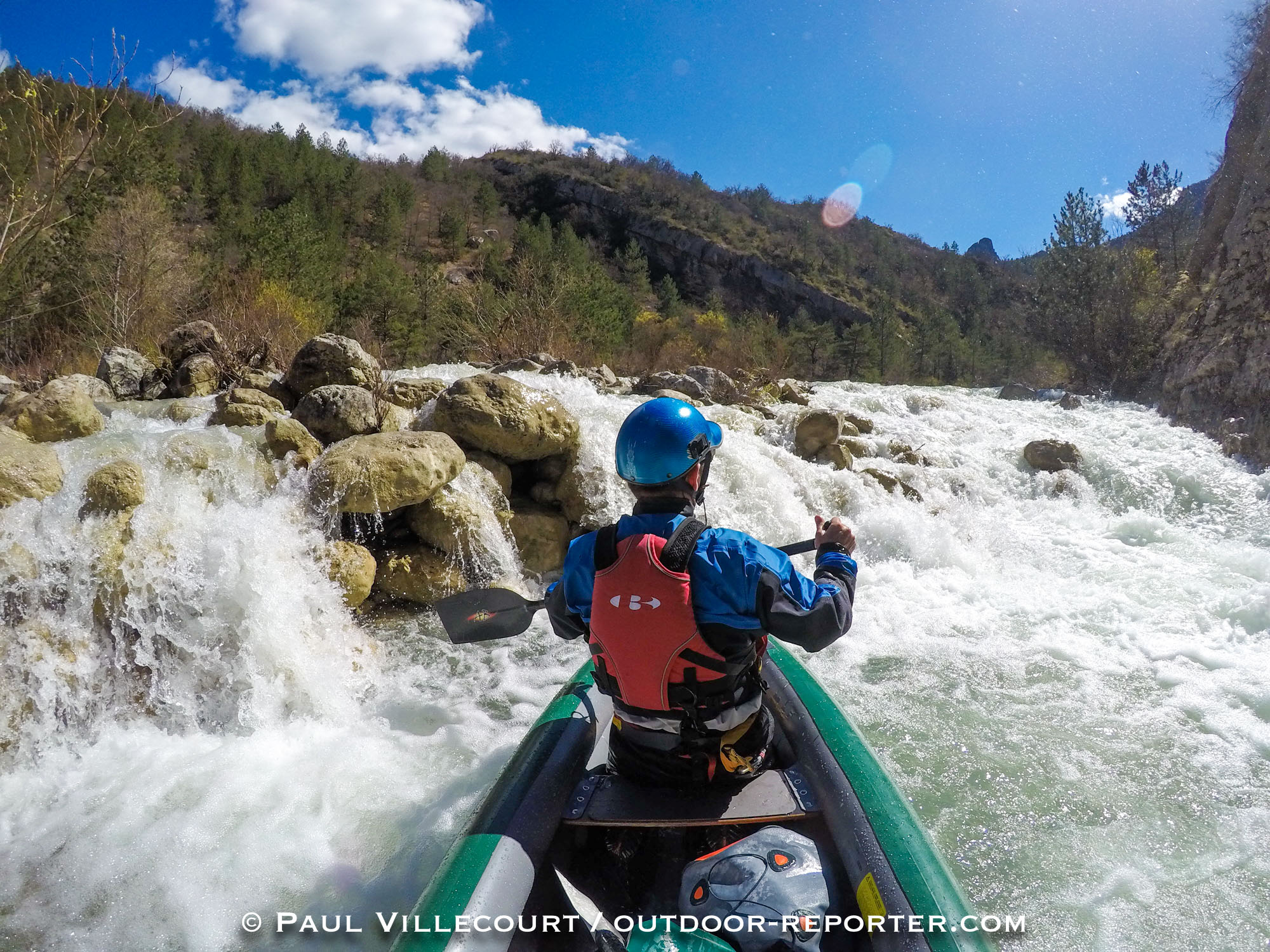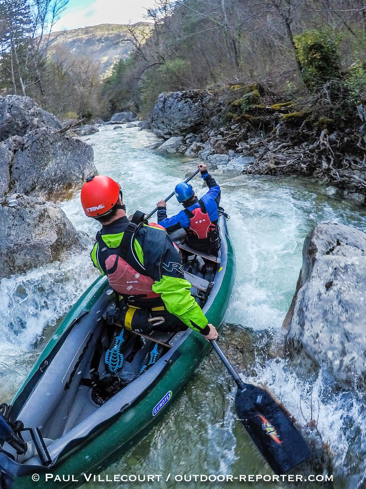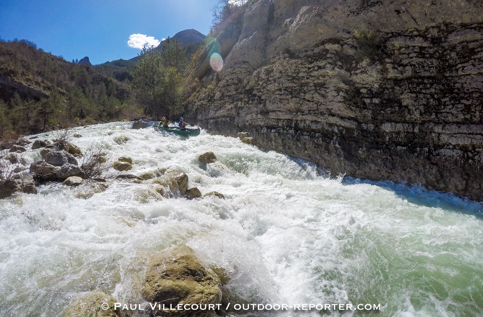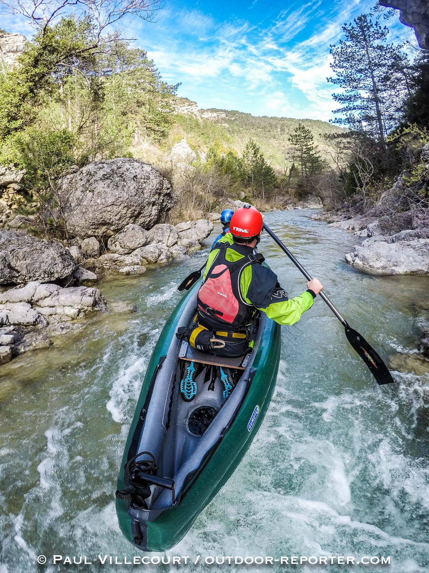 Du coup, nous avons eu envie de pousser le test un cran au-dessus. La Sure est une petite rivière oubliée, rarement en eaux, et surtout très courte : à peine 2 km. Mais quels parcours ! Une superbe série de petits seuils très techniques dans un décor à couper le souffle. Verdict : même pas mal ! Le Scout a franchi cet aqualand naturel avec facilité, et quand le parcours devenait trop dur, il permettait de sauter au bord en 2 secondes pour repérer. En plus d’être très stable, ce canoë gonflable (autovideur) est vraiment confortable.