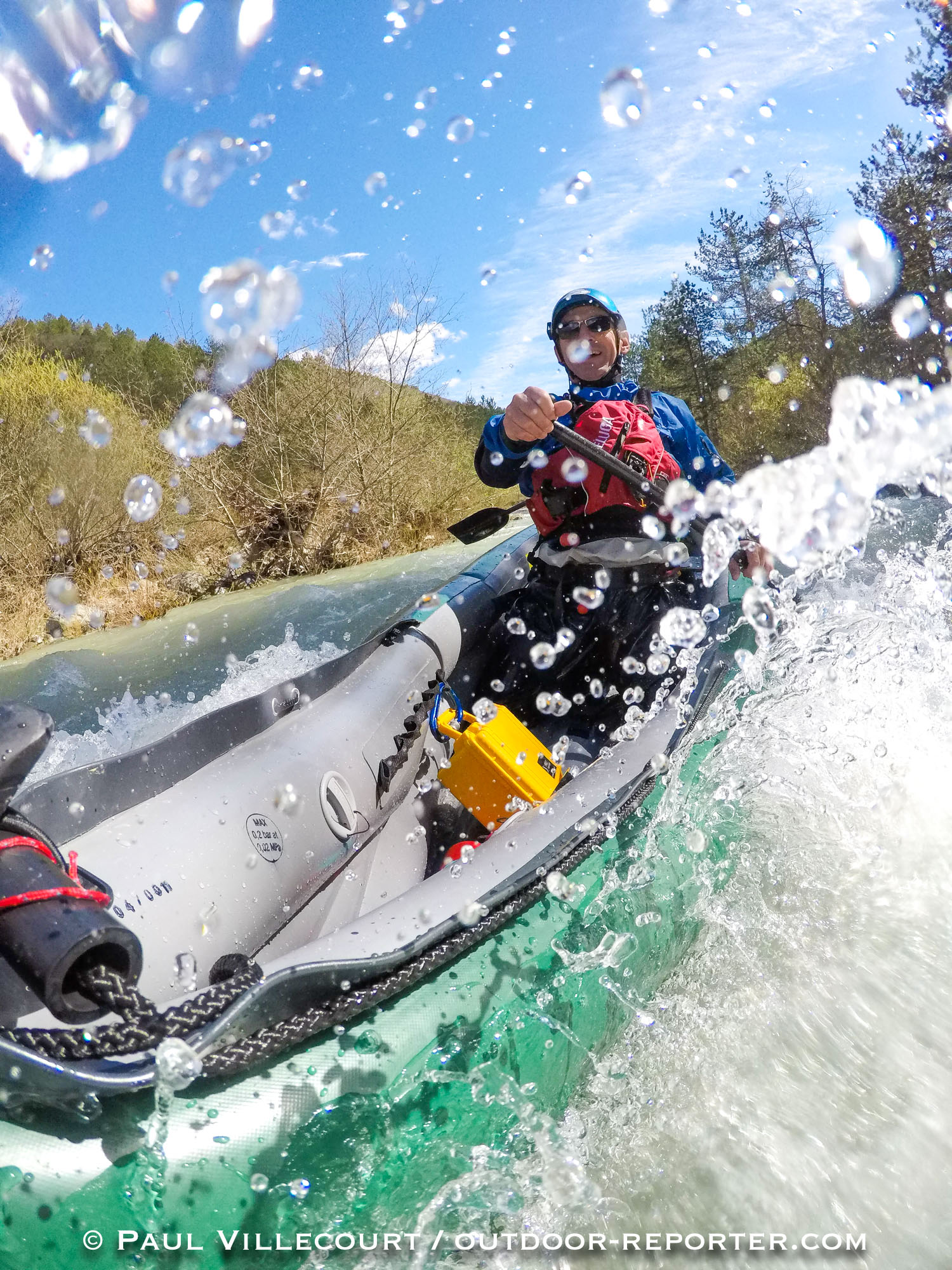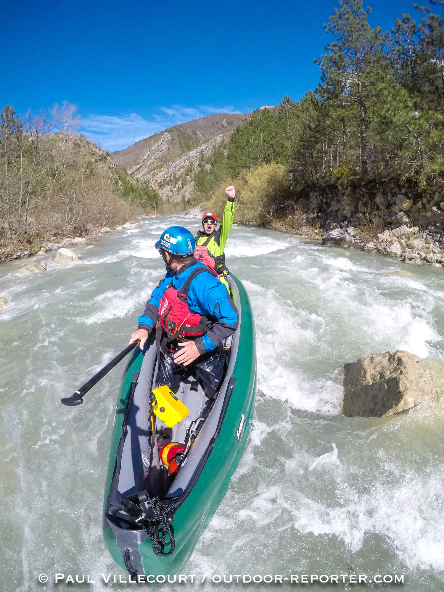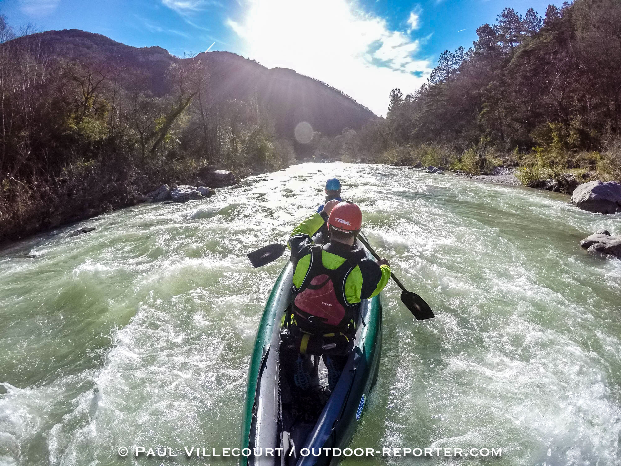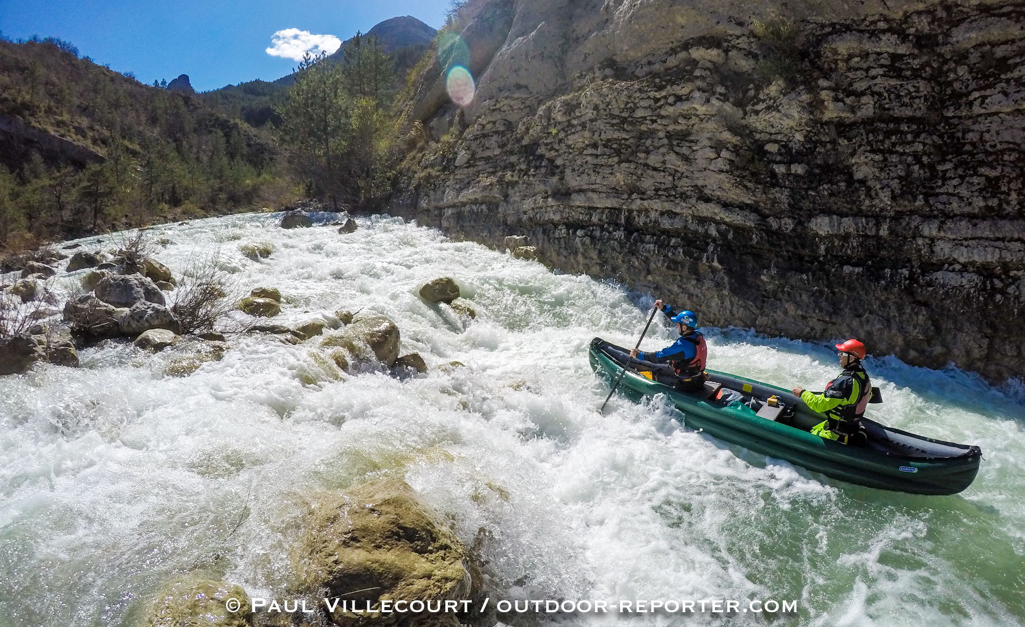 Un weekend trépidant ! Pour tester le dernier « jouet » fourni par notre sponsor, Gumotex, nous nous sommes lancés dans une sublime trilogie en enchaînant dans une même journée la Roanne, la Sure et la Drôme, toutes trois gonflées par les dernières pluies. L’objectif était de se frotter à des parcours très rapides, pentus et techniques, histoire de se préparer à l’Allier supérieur qui sera la section de rivière la plus difficile de la Grande Traversée (fin septembre). Ce weekend fut une vraie révélation ! Philippe et moi sommes bien sûr des kayakistes aguerris en plus d’être des canoteurs expérimentés. Habituellement, la place du kayak est plutôt sur les rivières rapides alors que le canoë est un randonneur au long cours. Pour être tout à fait clair : un canoë n’est pas à sa place sur une rivière difficile. Avec le « Scout » de Gumotex, il est enfin possible de ne plus choisir ! Ce célèbre canoë gonflable permet d’affronter des rapides très techniques en toute sécurité, avec une maniabilité extraordinaire.